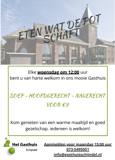Eten wat de pot schaft. Aanvang 12.00 uur Info zie flyer.